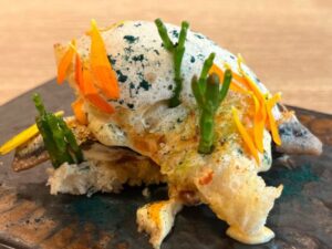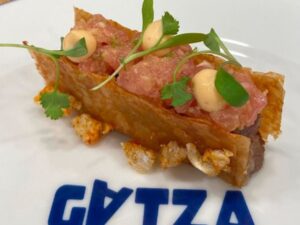 El bar Gatza que ganó ex aequo junto con el Amatxo, triunfó con el pincho ‘Bordaxaki Sando’, un bocado que homenajea a Bordaxaki, una granja de Ochagavía. A partir de sus cerdos prepararon tres elaboraciones: con la careta confeccionaron una terrina, con el lomo compusieron un tartar y con la piel hicieron chicharrón. Todo ello para imitar un sándwich japonés, el sando.